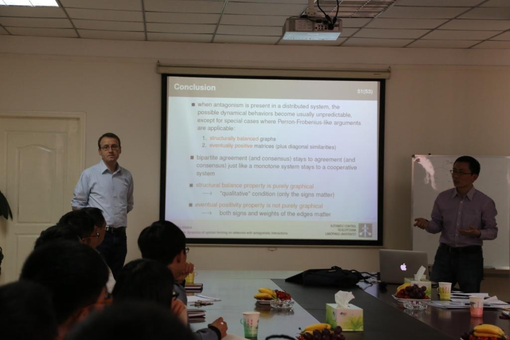 3月26日,中心师生迎来两场学术盛宴。上午10点半,中心会议室举办了题为“Scalable Control of Positive Systems/正系统的拓展控制”的学术讲座,由瑞典隆德大学教授Anders Rantzer主讲;下午4点,瑞典林雪平大学教授Claudio Altafini带来了另一场题为“Predictable dynamics of opinion forming on networks with antagonistic interactions”的学术讲座。两场讲座现场座无虚席,受到了师生们的一致好评。