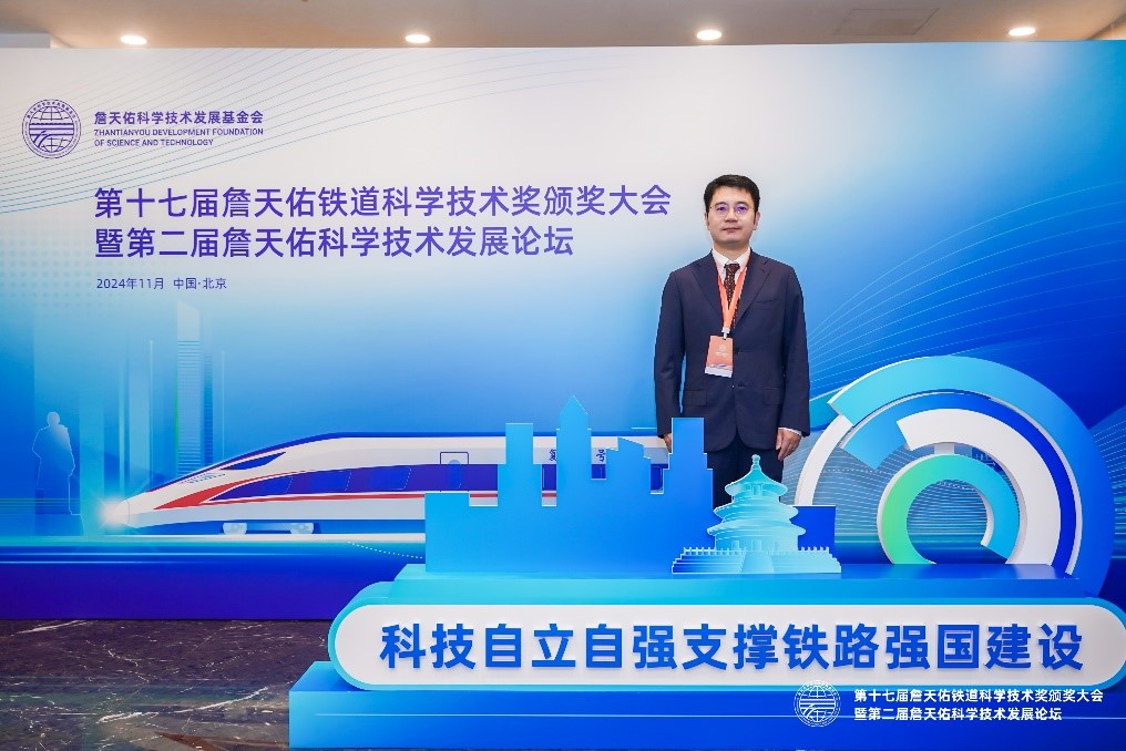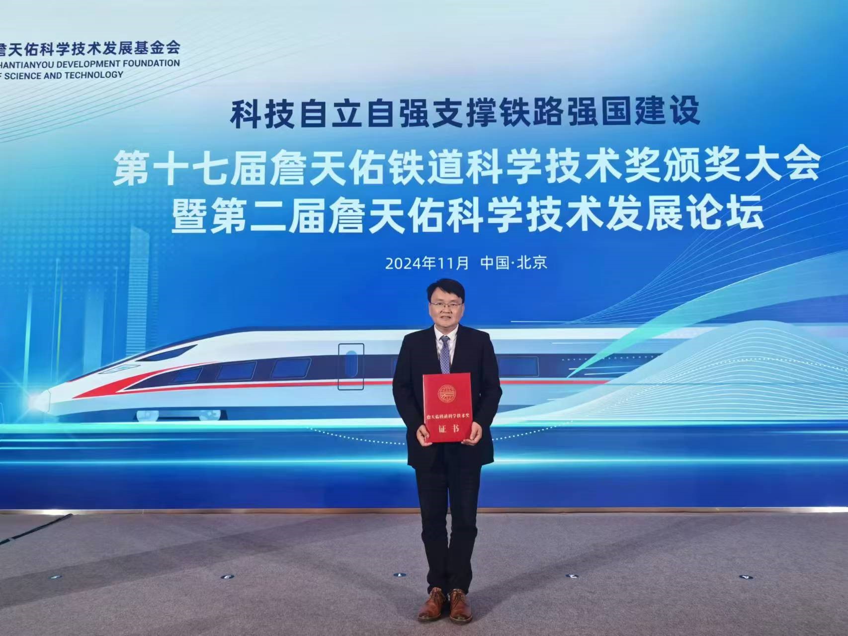 2024年11月15日,第十七届詹天佑铁道科学技术奖大会在北京举行。中国科协主席万钢,中国国家铁路集团有限公司党组书记、董事长郭竹学等出席会议并致辞。会上,詹天佑铁道科学技术奖3名最高奖、41名成就奖、90名青年奖和10个创新团队奖颁发,中央电视台进行了报道。中心刘志刚教授和郭裕均副教授分获詹天佑成就奖和青年奖。