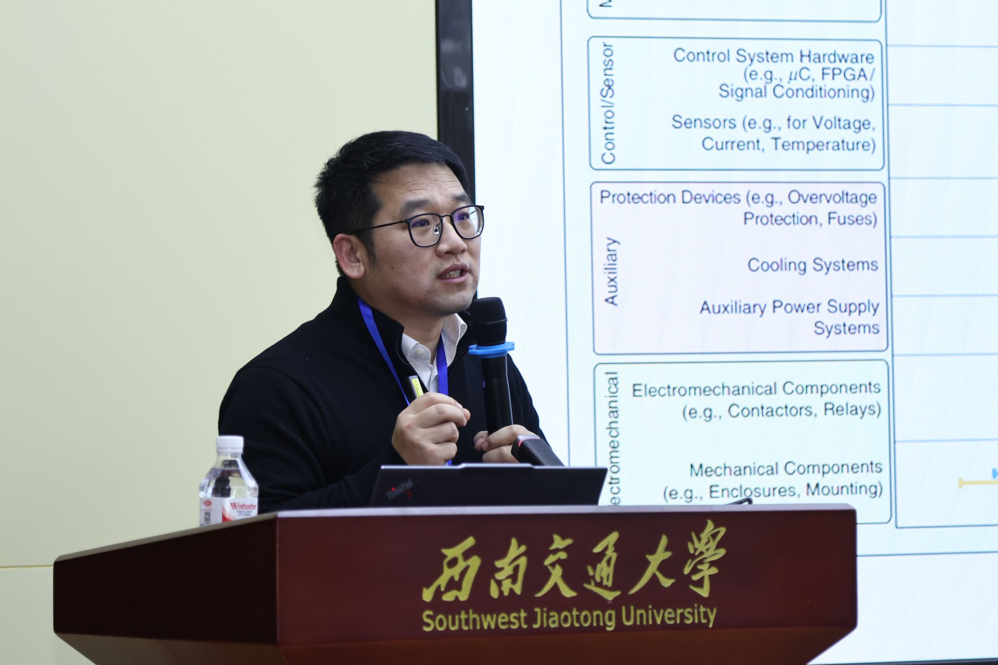 研讨会下半场,西南交通大学王砚帛教授、四川大学王栋教授、南京瑞途优特信息科技有限公司顾卫钢总经理以及西南交通大学/洛阳理工学院韩鹏程副教授,分别围绕新能源微网技术、高性能电机驱动系统、积木式电力电子平台设计以及柔性交流牵引供电系统故障诊断等主题发表演讲,由电子科技大学韩杨副教授与西南交通大学杨顺风教授主持。