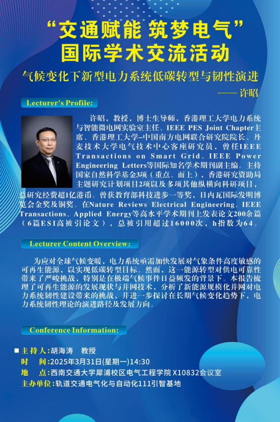 许昭,教授,博士生导师,香港理工大学电力系统与智能微电网实验室主任、IEEE PES Joint Chapter主席、香港理工大学-中国南方电网联合研究院院长、丹麦技术大学电气技术中心客座研究员,曾任IEEE Transactions on Smart Grid、IEEE Power Engineering Letters等国际知名学术期刊副主编。主持国家自然科学基金3项(重点、面上),香港研究资助局主题研究计划项目2项以及多项其他纵横向科研项目,总研究经费超1亿港币。曾获教育部科技进步一等奖,日内瓦国际发明博览会金奖及铜奖。在Nature Reviews Electrical Engineering、IEEE Transactions、Applied Energy等高水平学术期刊上发表论文200余篇(6篇ESI高被引论文),总被引用超过16000次,h指数为64。